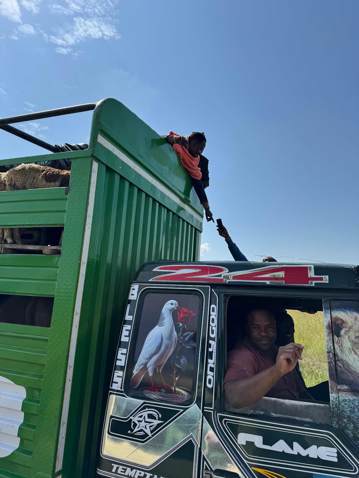 Once we were inside the park, our driver Thom spotted a cell phone on the roads d he knew immediately it belonged to some locals who were riding in the back of a big truck moving domestic animals. Being the Good Samaritan, Neil Zeller was determined to chase down the truck and return the phone to the owner. So we went on a car chase to catch up to the big truck. After 10 or 15 minutes of high speeds (for the Serengeti) we caught up to the vehicle and returned the phone. The owner was very appreciative.